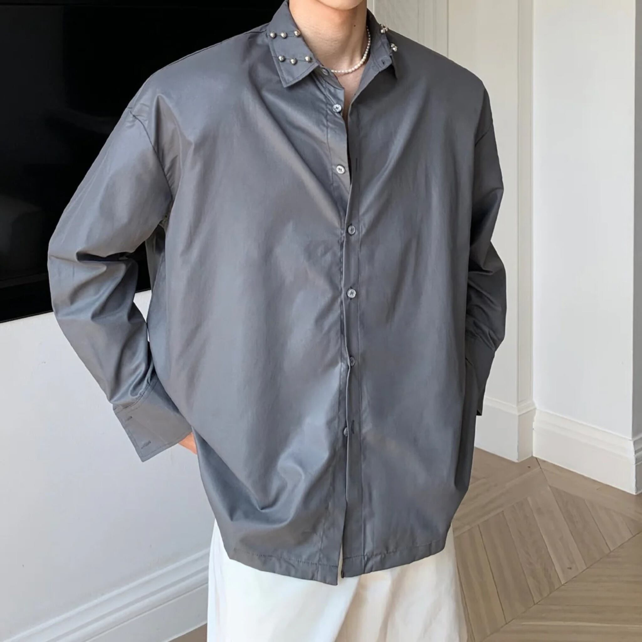 モード感あふれる光沢素材と独特のデザインが際立つ長袖シャツ。