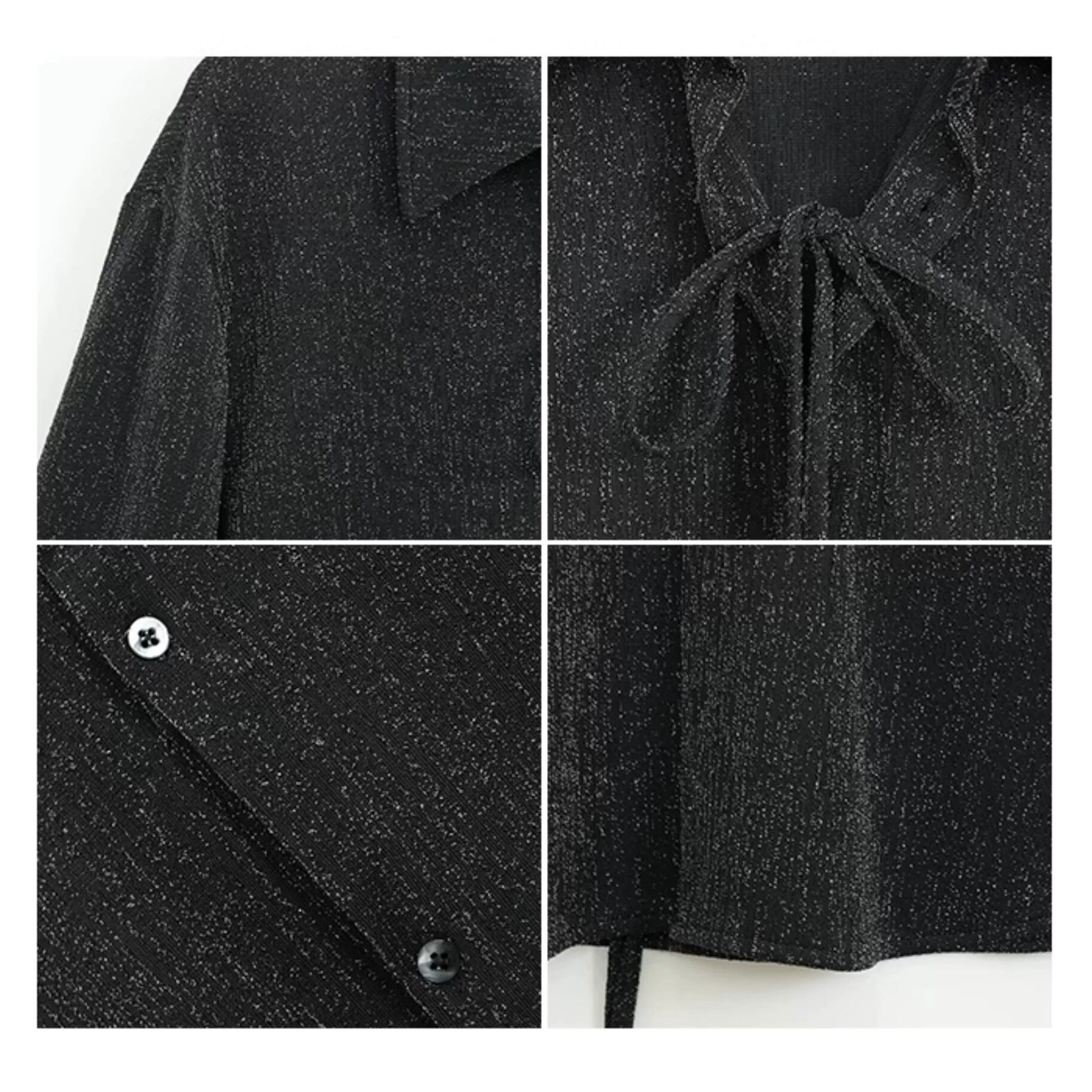 洗練されたシルバーラメが織り込まれた、ブラックの長袖シャツ。シンプルながらも個性的なデザインで、ドローストリングディテールがスタイリングの幅を広げます。
