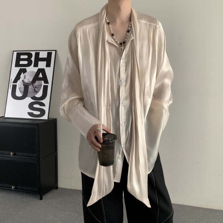 このシャツは、シルクのような光沢感と滑らかな肌触りを持つ高級アイスシルク素材で作られており、上品でエレガントな印象を演出します。フロント部分に施されたロングスカーフデザインが、独特の垂れ感と動きのあるシルエットを生み出し、洗練されたスタイルを際立たせます。